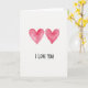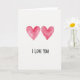 This greeting card shows two pink watercolor hearts side by side near the top, set against a plain white background. The hearts look soft and slightly uneven around the edges, with gentle light-and-dark pink areas that blend like wet paint. Their simple shape and quiet look make the card feel honest and close to the heart. Beneath the hearts, the words “I LOVE YOU” are printed in dark lettering that looks like casual handwriting, centered near the bottom. The strong dark text stands out clearly and balances the airy space around it. It’s a meaningful card to give because it says a lot without crowding the page, making room for your own feelings. Whether it’s for a partner or someone you care about deeply, it carries a warm, steady kind of love 🥰❤️.