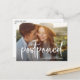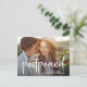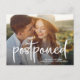 Modern Wedding Announcement Postponement Photo Postcard. Design features calligraphy script overlay in white ''postponed'' , your photo and details on the back.