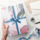 Simple modern wrapping paper depicts a delicate sketched floral watercolor design including pink spring tulips with green and grey leaves on a white background.