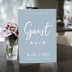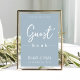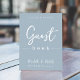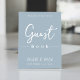 This design features wedding simple modern sign signage, guestbook guest book quote saying, minimalist minimal dusty blue, a reception guest bar tabletop sign, dusty blue minimalist minimal style, modern calligraphy script text font, an elegant trendy stylish typography font, an elegance simplistic reception guest sign, a guest book modern style, a custom customize reception signs