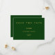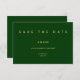 A wedding Save the Date that is done in emerald green with gold tone (non-foil) typography with just enough information to win the day. This item is part of a wedding collection that includes your choice of invitation, an RSVP card, Save the Date, and more. Place your information on this card, add it to your cart, and have a wonderful wedding.