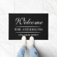 Modern & elegant custom doormat. This Design features white text "Welcome" in calligraphy script writing with family's last name , your home's street address and simple horizontal divider line accents.