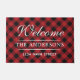 Modern & elegant custom doormat. This Design features white text "Welcome" in calligraphy script writing with family's last name , your home's street address and simple horizontal divider line accents on black and Red Plaid Pattern background.
