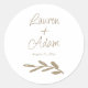 Enhance your wedding favours with a modern touch of elegance using this stylish round wedding sticker. It boasts a pristine white background and faux gold script typography. Customised with your names and wedding date, this chic sticker is ideal for sealing envelopes, embellishing favour bags, gift boxes, thank you cards, or welcome bags. Its minimalist design and romantic handwritten font offer a timeless, sophisticated appearance suitable for contemporary, classic, or evening weddings.