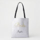 Simple white gold black wedding Bride custom design name tote bag. Floral minimalist pattern customize typography. Classy, chic, elegant, modern, trendy, stylish, beautiful bridal succulent metallic. To change script, click edit design. Image copyright Marg Seregelyi Photography.