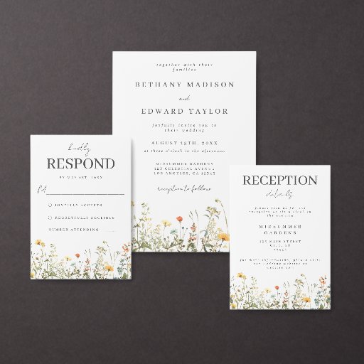 Plain white envelopes are included with paper invitations and will come to fit the invitation size you select. If you don’t need the envelopes, you may choose to not receive them by selecting the dropdown below "Envelopes" and choosing "None." If you’d like to have a design on your envelopes, you can browse all of these available envelopes to find the design that complements your Simple Wildflower Wedding Invitation.