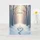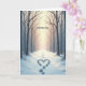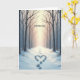 This greeting card shows a snowy path stretching into the distance between rows of bare trees in gray and deep blue. The snow on the ground looks soft and slightly wind-shaped, with gentle shadows that make the scene feel quiet and still. Near the bottom front, a heart shape formed from snow-covered bushes sits in the fresh powder, like a small secret waiting to be noticed. A line of single footprints starts near that heart and heads down the path, hinting at someone walking toward a special moment. Far ahead, the background turns into a warm golden glow, and the words “WINTER LOVE” appear within that light in simple uppercase letters. The contrast of cool winter colors with the warm light makes it feel hopeful, like love can be steady even on the coldest days ❤️. It’s a meaningful card to give because it quietly says, “I’m with you,” whether you’re sharing romance or close friendship 🥰.