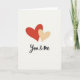 This card shows two overlapping hearts on a white background, placed a little above the middle. The larger heart on the left is deep red, and it sits slightly in front to draw your eye. A smaller heart in warm beige peeks out from behind on the right, like two people leaning close. Both hearts have a soft shadow that makes them look gently layered. Under the hearts, the words “You & me” appear in black, written in a flowing cursive style across the lower center. The simple space around the design keeps the focus on closeness and connection, which can feel really meaningful to give 🥰. It’s a sweet way to share Valentine’s Day feelings with someone you care about ❤️.