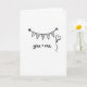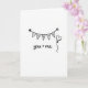 This greeting card shows a simple black-and-white drawing that feels sweet and close to the heart ❤️. Near the top center, a curved banner spells “LOVE” across five small triangle flags, outlined in black. The “V” is shown as an upside-down heart, which makes the message feel extra tender. Small starburst shapes sit at both ends of the banner like little sparks. Under the banner, the words “you + me” appear in small, rounded, casual lettering, placed right in the middle. On the right side, a heart-shaped balloon floats upward with tiny dotted marks on it, and a thin string hangs down. It’s a meaningful card to give because it keeps the message simple: it’s about choosing each other and feeling connected 🥰. Hope it helps you share your Valentine’s Day sentiments with someone you care about.