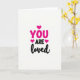 This greeting card features the message “YOU ARE loved” on a white background, with a few small fuchsia hearts scattered around for a sweet touch ❤️. “YOU” is large and magenta, set near the top of the card in thick, simple letters that grab your attention right away. The dot in the “U” is replaced by a tiny heart, which makes the word feel more caring. Just below it, “ARE” appears in smaller black letters, centered and easy to read. At the bottom, “loved” is written in flowing black cursive, stretching wider than the words above and giving the message a softer feel 🥰. Two little fuchsia hearts sit near “ARE,” like gentle reminders of what the card is really about. It feels meaningful to give because it’s direct, reassuring, and says what many people need to hear without adding anything extra.