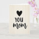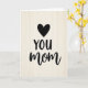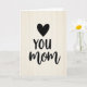 This card features a simple, affectionate layout that feels like a quiet hug ❤️. A solid black heart sits near the top, drawing the eye down to two centered lines of flowing lettering. The word “YOU” appears first in black, slightly smaller, with “MOM” placed directly beneath it in larger black letters for emphasis. The gentle contrast between the dark ink and the soft background adds a closeness, like a warm note left where she’ll find it. Behind the text, a cream-toned surface shows faint vertical wood-grain lines that bring a cozy, homey touch 🌼. The lighting is even and soft, keeping the edges of the heart and letters crisp without harsh shadows. The heart is positioned above the words with plenty of open space around it, and the wood texture runs straight down the background.