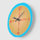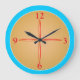 A very plain clock with blue/aqua border and gold centre. Simple Red design and numerals. A great gift for christmas and special occasions. Available in round and square shapes .