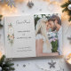 This lovely winter botanical guest book features bouquets of ivory roses and flowers, red holly berries, fir and golden snowflakes surrounding an elegant gold label for your monogram on a pale pearl grey background. Includes editable text fields and photo template.