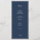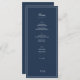 Nautical Blue background for simple, yet elegant typography based design. Couple's monogram footer. White on dark navy blue. Reverses to solid blue color. Menu card has French and Sans serif fonts with single line embellishment under "Menu".