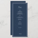 Nautical Blue background for simple, yet elegant typography based design. Couple's monogram footer. White on dark navy blue. Reverses to solid blue color. Menu card has varied fonts and single line embellishment under "Menu". A very Nautical look in both color and typography.