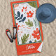 Bright red-orange, dark teal, pine green, pale aqua and peach colors create a fun and colorful result with these simple botanical motifs. The bright red-orange flowers just make this design look happy for you. The three-color edge frames the design nicely. Personalize with a name and a location or event name. Beach towels make great gifts!