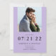 This simple save the date card offers a photo on the front and one on the back. The background is light purple with the wedding date appearing large in black.