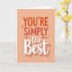 This card features a friendly typographic design that reads “YOU’RE SIMPLY THE BEST” on a soft peachy-orange background, setting a warm, affectionate tone ❤️. “YOU’RE SIMPLY” sits near the top in rounded coral letters, spaced evenly so it feels open and welcoming. The small word “the” appears tucked between lines in a thinner coral style, acting like a gentle pause before the main phrase. “Best” stretches across the lower portion in large white flowing letters, creating a strong focal point against the warmer backdrop. Each letter carries a subtle shadow that makes the wording look slightly raised, like it’s floating just above the surface. Around the text, tiny confetti-like dots, small star shapes, and slim arrows add a light, friendly energy, as if cheering someone on 🌼. A bright red heart sits above the lower wording, centered among the scattered dots and asterisks.