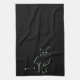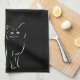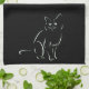 A simple white sketch, line art, of a sitting cat on black. A black and white cat design with utterly plain elegance.