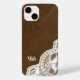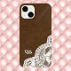 This printed-on design looks like brown leather and lace for a trendy, sleek unique design. The lace edging loops up on the right bottom, with your initials in a swirly script on the left. The printing simulates the look of leather and lace, but it doesn't have actual leather, leather texture, or lace. Type your initials in the Personalize section.