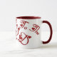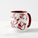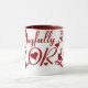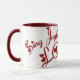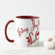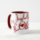 Red hearts and lettering adorn this bright and cheery morning mug.