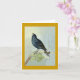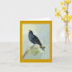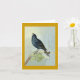 This is a vintage image of a singing blackbird. He is sitting on a branch with leaves with a tiny caterpillar. The background is blues and grays with a mustard border. See my store for other products with this design.