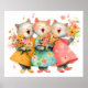 Three singing cats in colorful dresses holding bouquets of wildflowers.