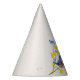 This paper party hat is white with a singing little red and blue bird standing on a branch with pretty bright yellow flowers. Customise the Happy Birthday text with the template.