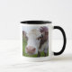 Single cow peerring into camera mug