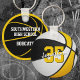 This cool basketball themed keychain features the realistic image of a basketball that has alternating black, white and gold recolored panels on the front and a simple black basketball shape on the back - easily personalize with player name & jersey number on the front and school or club name & mascot name on the back - by katz_d_zynes