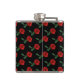 This hip flask features a repeating pattern of an exquisite single scarlet red rose with three green leaves against a black background.