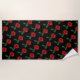 This lovely decorative floral beach towel displays a repeating pattern of an exquisite single scarlet red rose with three green leaves against a black background.