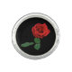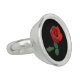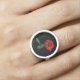 This elegant floral ring features a single red rose with green leaves set on a pure black background.