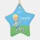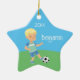 Personalize this cute soccer ornament for the soccer-loving boy in your life! This ornament features a blonde boy kicking a soccer ball on a green field with a blue sky. Also available in other colors for extra customization.