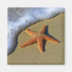 Striking beach photography, a bright orange starfish on the waters edge about to be covered by a gentle wave.