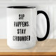 Design is composed of modern typography with sans serif font. Funny quote: Sip Happens, Stay Grounded.