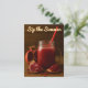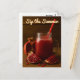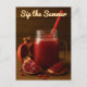 Send a burst of bold flavor with this striking pomegranate juice postcard! A mason jar brimming with deep red juice is surrounded by lush, jewel-like pomegranate seeds — all set against a rich wooden backdrop with refreshing water droplets.