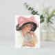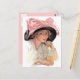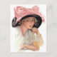 Young woman sipping a soda drink while wearing a big black hat with large pink bow. A delightful vintage scene.