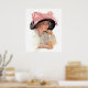 Young woman sipping a soda drink while wearing a black hat with large pink bow. A delightful vintage scene.