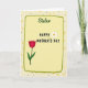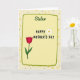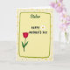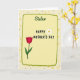 This card features a soft rectangular panel in pale yellow, like a cozy note set gently on the page, with a tender, sisterly closeness suggested by the calm spacing and balanced layout ❤️. Near the top of the panel, the word “Sister” appears in dark green, flowing lettering that feels like a quiet, affectionate address. Centered beneath it, “HAPPY MOTHER’S DAY” is set in dark green capital letters, larger and easy to spot against the light background. A single red, cup-shaped flower with a green stem grows up from the lower left, adding a romantic touch like a small bloom offered with care. In the upper right, a small white daisy with a yellow center sits near the text, adding a friendly, sunny accent 🌼. The panel is outlined by a deeper green border with gentle, uneven curves that make the frame feel soft and relaxed. Behind it all, the larger background is a creamy yellow scattered with faint yellow dots and a few tiny green specks.