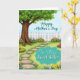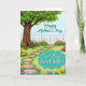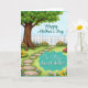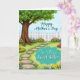 This design shows a large leafy green tree on the left, spreading its canopy against a calm blue sky, while a neat white picket fence runs across the middle like a gentle divider. In front of the fence, flowering shrubs cluster in sunny yellow, soft pink, and light purple, arranged as if they’re leaning in close together like friends. A curved path of rustic stepping stones starts at the lower left and wanders through a trimmed green lawn, inviting a slow walk and a quiet chat ❤️. Near the top, the words “Happy Mother’s Day” appear in flowing teal lettering, floating above the scene. Closer to the bottom, “To My Sweet Sister” sits inside a scalloped teal label that stands out against the grass. The lighting looks bright and soft, giving the garden a tender, welcoming glow 🌼. A small bird with deep blue feathers and a tiny orange mark on its face perches near the top greeting.