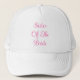 Custom Trucker Style Baseball Cap Hat In White and White Color printed with Sister Of The Bride in Pink text typography lettering and digital graphic design by TheFabricSeal print on demand shop at Zazzle.com #ZazzleMade https://www.zazzle.com/store/thefabricseal TheFabricSeal©️Original.