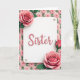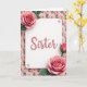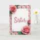 This card features a white rectangular plaque with softly rounded corners, centered like a keepsake tag. The word “Sister” sits across the middle in raised, soft pink lettering, with the text standing out against the pale background. Small metallic-looking rings appear near the top corners, as if the plaque could be tied or hung. Two large pink roses frame the scene—one near the upper left and one near the lower right—while their layered petals curl inward like they’re leaning toward each other in a gentle, affectionate gesture ❤️. Deep green leaves spread around the blooms, and a small rosebud along the right side adds a quiet note of closeness, like a budding friendship. Behind everything, a repeating field of tiny daisy-like flowers in light pink with darker centers fills the background, dotted with thin green stems 🌼. Soft, diffused light creates mild shadows under the raised letters and along the rose petals, and the overall palette stays in pale pinks, white, and fresh green.