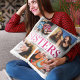 Sibling sister pillow featuring a 4 photo collage, the word "sisters" in a cute girly pink gradient, a personalized quote, and your names.
