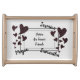 Give your sister a gift that expresses your love with a serving tray adorned with deep red hearts and a special message. Perfect for afternoon tea or breakfast in bed, this tray features painted dark red hearts in a variety of sizes. "Sisters are Forever Friends" appears inside a double framed rectangle. Your name as well as your sister's names appear around the design. Personalize name, delete unneeded spaces, or add additional names to create a one of a kind gift your sister will treasure.