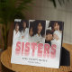 Modern sister photo plaque featuring 3 family pictures for you to replace with your own, the title "sisters", a personalized saying that reads "make the best friends", and your names.