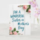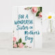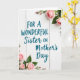 This card features a calm, light-toned wooden plank background with faint grain lines and narrow seams that add a cozy, homey feel. Centered across most of the front is the message “FOR A WONDERFUL” in teal blue, set in a simple upright font that’s easy to read. Just beneath it, “Sister ON Mother’s Day” appears in the same teal, using a flowing, cursive-like style that feels like a gentle note written with care ❤️. Soft floral clusters frame the words from opposite corners, drawing the eye in like a quiet embrace between close family members. In the top right and bottom left, blush-pink blossoms mix buds and partially opened blooms, suggesting a tender, growing bond. Slender green stems and leafy sprigs curl around the petals, adding natural shape and a touch of warmth 🌼. The flowers sit in the corners with pale pink petals, fresh green leaves, and thin stems against the white wood background.