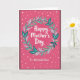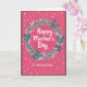 This card features a deep fuchsia background that softly brightens toward the center, drawing attention to a circular wreath of stylized leaves in teal, muted blue-grey, and soft coral. Centered inside the wreath, the main line reads “Happy Mother’s Day” in white, flowing lettering, giving the message a gentle, affectionate focus ❤️. Just below, a smaller line says “To a Wonderful Sister” in matching white lettering, placed neatly under the main words as if spoken in a close, caring aside. The leaf shapes curve toward each other around the circle, creating a tender, gathered look that suggests closeness and support between loved ones. Across the magenta field, irregular white dots are scattered like confetti, adding a light, celebratory feel 🌼. A thin deep maroon border frames the entire design, keeping the bright center contained and tidy. The wreath sits centered on the page, surrounded by the dotted pattern and enclosed by the narrow maroon edge.