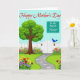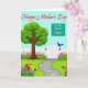 This card shows a sunny garden scene with a tall tree at the center, its sturdy brown trunk reaching into a broad canopy of textured green leaves against a soft light-blue sky. A white picket fence runs across the middle with an arched gate, and a curving path of uneven gray stones leads in from the bottom edge as if inviting a gentle walk together. Thick green grass spreads on both sides, dotted with clusters of yellow, red, orange, purple, and pink flowers that feel like a cheerful bouquet laid across the ground 🌼. A small blue bird with a golden beak sits on top of a gatepost, angled as though it’s watching over the entrance with quiet affection. In the upper left, the words “Happy Mother’s Day” appear in red lettering, placed clearly against the sky for easy reading ❤️. On the upper right, a teal rectangle with a thin border holds the message “To My Sweet Sister” in white lettering, set neatly inside the frame. The gate’s curved top stands out in crisp white lines, with the blue bird perched just above it on the post.