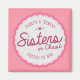 Bold and elegant Christian emblem design with words, "Sisters in Christ" in script with banner design elements on pink circular emblem with dark pink dotted background. Top center of emblem has area for your custom names (friends names) in dark pink type in semi-circle. Bottom semi-circle (centered below Sisters in Christ typography) has words, "UNITED IN HIM" but can be customized to fit your needs. Great gift for any Christian sister.